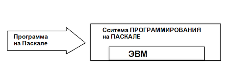 Обсуждение методических вопросов изучения темы «Алгоритмы работы с величинами» буде проводить в программистском аспекте. Составление любой программы для ЭВМ начинается с построения алгоритма. Как известно, всякий алгоритм (программа) составляется для конкретного исполнителя, в рамках его системы команд. О каком же исполни теле идет речь в теме «программирование для ЭВМ»? Ответ очевиден: исполнителем является компьютер. Точнее говоря, исполнителем является комплекс «ЭВМ + система программирован и (СП)». Программист составляет программу на том языке, на который ориентирована СП. Иногда в литературе по программированию такой комплекс называют «виртуальной ЭВМ». Например, компьютер с работающей системой программирования на Бейсике называют «Бейсик-машина»; компьютер с работающей системой программирования на Паскале называют «Паскаль-машина и т. п. Схематически это изображено на рис. 1.