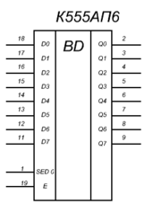 Режим работы определяется комбинацией сигналов на двух входах управления - Е и SED0. При низком уровне напряжения на входе управления третьим состоянием Е, направление передачи определяется логическим уровнем на входе SED, а при высоком уровне напряжения на входе Е выходы микросхемы переводятся в высокоимпедансное состояние.