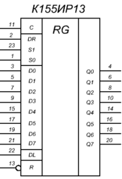 Возможны 4 режима работы: параллельная загрузка, сдвиги вправо (от D1 к D8) и влево (от D8 к D1),блокировка.
