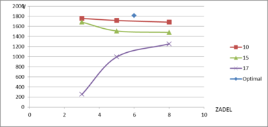 Решение найденное экспериментальным путем с помощью многочисленных прогонов (V=1812,81, TAU=15, ZADEL=6) оказалось близким со значением (V=1712,64, TAU=16, ZADEL=3) найденным программой после проведения оптимизирующего эксперимента, но не точное.