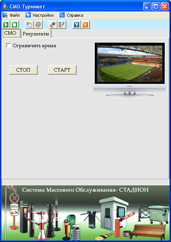 В данном курсовом проекте необходимо создать программу, которая имитирует работу турникетов на стадионе. По введенным параметрам работы системы: среднему времени появления зрителя, времени его обслуживания, количеству аппаратов обслуживания, количеству зрителей или ограничению времени, позволяет пользователю производить анализ о количестве необходимых аппаратов обслуживания и их загруженности, состояния в определенный момент времени и эффективности работы. Так же имеются зрители-гости, приходящие по пригласительным билетам, которые пропускаются без очереди. Время появления и обслуживания таких зрителей также может быть задано пользователем. Очередь к каждому турникету своя. Выбор аппарата обслуживания зрителем строится по принципу: где меньше народа.
