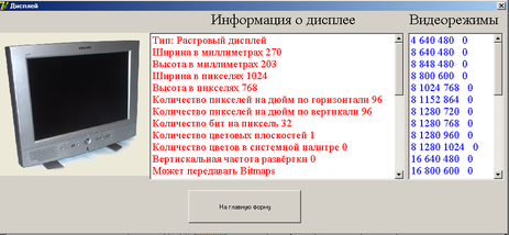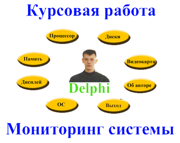 Основное окно состоит из формы на которой имеются кнопки: Процессор, память, дисплей, ОС, диски, видеокарта, об авторе и выход.