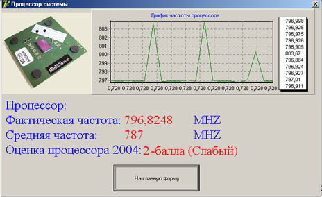 При нажатии кнопки процессор появляется (Рис. 5.2) окно на котором показано: название процессора, реальная частота его загрузки, график загрузки, средняя частота, и балловая оценка
