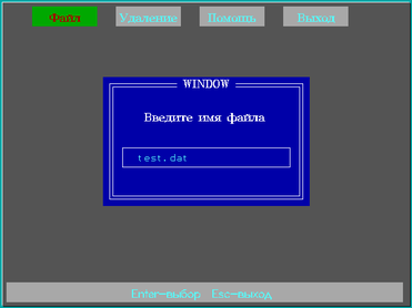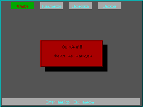 На экран выводится окошко с запросом о вводимом файле, после чего нужно ввести имя файла, нажать клавишу Enter. Далее произойдет загрузка и вывод содержимого файла на экран, либо окошко, оповещающее о том, что загрузка не удалась по какой-либо причине. Для экстренной остановке выполнения какой-нибудь команды, используйте клавишу Esc.