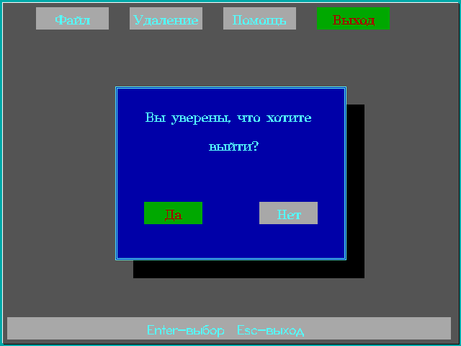 Передвижение по меню осуществляется с помощью клавиш “↑” и “↓”. Для выбора пункта меню нужно нажать Enter. Для выхода из меню нужно нажать ESC. Передвижение по пунктам подменю осуществляется с помощью клавиш “↑” и “↓”. Для выбора пункта подменю нужно нажать клавишу Enter. Для выхода из подменю нужно нажать клавишу ESC. Из основного меню путем нажатия клавиши Esc осуществляется вызов пункта меню “Выход”.
