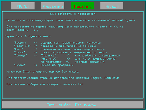 наличие удобного интерфейса в виде меню с системой подсказок, позволяющих пользователю управлять программой;