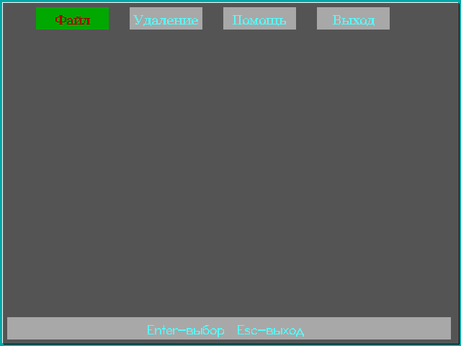 На экран выводится вертикальное меню, состоящее из трех подпунктов: “Загрузка”, “Очистка”, “Выход”. Хождение по меню осуществляется с помощью нажатия клавиш и . Для выбора одного из пунктов необходимо нажать клавишу Enter.