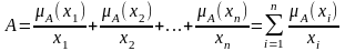 Приведений запис має символьний характер. Знак "-" не означає ділення, а означає приписування конкретним елементам х1, …, хn степенів приналежності A (x1),…, A (xn). Іншими словами, запис