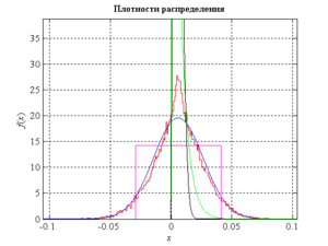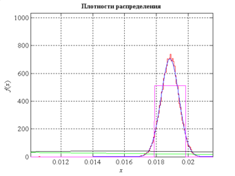 Построим на одном графике теоретическую и эмпирическую плотности распределения вероятности. Эмпирическая плотность распределения – это гистограмма, у которой масштаб по оси ординат изменен таким образом, чтобы площадь под кривой стала равна единице. Для этого все значения в интервалах необходимо разделить на nh, где n – объем выборки, h – ширина интервала при построении гистограммы. Теоретическую плотность распределения вероятности строим по одному из выражений (4), (6), (8), (10), параметры для них уже вычислены. Эмпирическую плотность распределения нарисуем красной линией, а предполагаемую теоретическую – линией одного из цветов: синего, зеленого, сиреневого или черного.