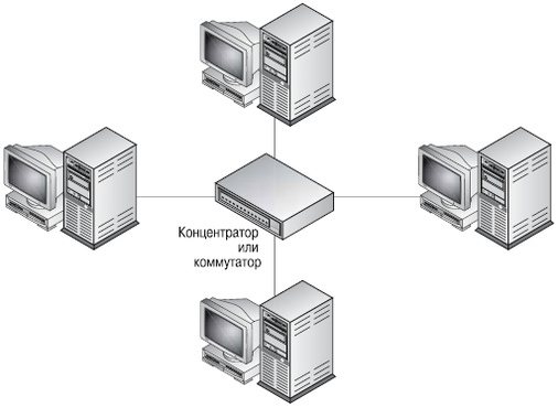Рис. 1.3. Топология ”звезда” упрощает выявление проблем с сетевым кабелем, поскольку сбой локализуется в одном звене