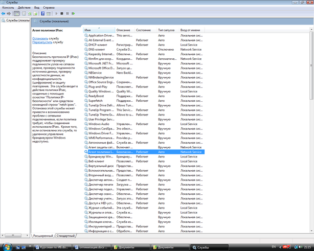 Во время работы Windows Vista запускается и работает много служб. Но не все службы необходимы для нормальной работы компьютера. Ниже приводится список сетевых служб или служб, связанных с информационной безопасностью, деятельность которых желательно контролировать. Быстрый доступ к списку служб можно получить с помощью команды services.msc в Пуск -> Выполнить.