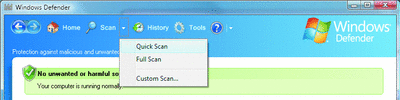 Чтобы инициировать сканирование, запустите Защитника Windows и щелкните на стрелке "вниз" рядом с кнопкой Scan; затем выберите тип сканирования.