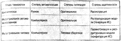 Сочетание различных признаков классификации методов обусловливает характер используемых технологий проектирования ИС, среди которых выделяют два основных класса: каноническую и индустриальную технологии (табл. 5.). Индустриальная технология проектирования, в свою очередь, разбивается на два подкласса: автоматизированное (использование CASE-технологий) и типовое (параметрически-ориентированное или модельно-ориентированное) проектирование. Использование индустриальных технологий не исключает использования в отдельных случаях канонических.
