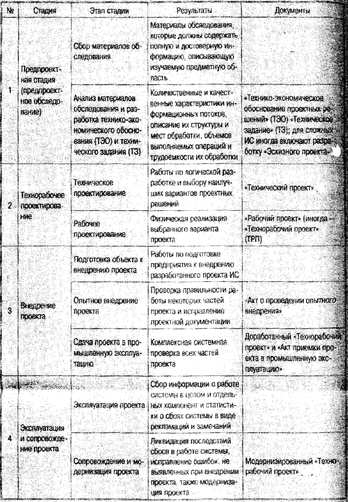 В целях изучения взаимосвязанных приемов и методов канонического проектирования ИС перечисленные семь стадий можно сгруппировать в часто используемые на практике четыре стадии процесса разработки ИС (табл. 6.)