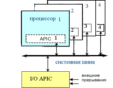 Система с APIC (рис.3.) состоит из локальных контроллеров, установленных в процессорах, и контроллеров прерываний (одного или нескольких) от устройств ввода/вывода. Задача каждого локального контроллера (Local APIC) — трансляция полученных сообщений в сигналы, вызывающие все аппаратные прерывания своего процессора — маскируемые (INTR), немаскируемые (NMI) и прерывания системного обслуживания (SMI). Кроме того, локальные APIC позволяют каждому процессору генерировать прерывания для других процессоров. Локальный контроллер имеет внутренний интервальный таймер, позволяющий вырабатывать прерывания через программируемый интервал времени.
