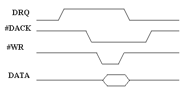 Контроллер DMA имеет несколько каналов. Каждому периферийному устройству, работающему в режиме прямого доступа к памяти выделяется канал с определенным номером. Устройство может послать контроллеру запрос обмена — DRQx и получить разрешение обмена — DACKx#. На шине управления устанавливается сигнал записи или чтения данных при работе внешнего устройства с памятью. Для передачи данных используется шина данных (рис.5.). При операциях с прямым доступом к памяти по каналу DMA адрес порта указывать не требуется, посылаемые сигналы идентифицируются по номеру канала. Временная диаграмма цикла передачи данных из внешнего устройства в память будет выглядеть следующим образом: