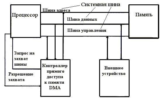 Процессор программирует специальный контроллер (контроллер DMA) на обслуживание работы внешнего устройства в режиме прямого доступа к памяти. Он задает адрес памяти, размер передаваемого блока данных, направление передачи (чтение или запись), после чего дает команду на выполнение.