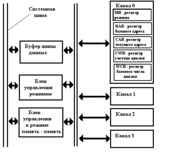 Получив запрос DRQx ( х - номер канала DMA, выделенного устройству), контроллер DMA запрашивает управление шиной и ждет разрешения от процессора. Процессор прерывает выполнение текущей программы, программирует контроллер прямого доступа на определенный режим передачи данных и посылает сигнал разрешения прямого доступа к памяти. Контроллер выставляет адрес ячейки памяти и формирует сигналы DACKx# и WR#. Сигнал DACKx# указывает на то, что операция выполняется для канала х, WR# определяет режим записи данных, при чтении устанавливается сигнал чтения RD). Контроллер передавая данные модифицирует счетчик адреса и осуществляет передачу одного слова за другим. Контроллер повторяет эти шаги для каждого следующего сигнала DRQx, пока не будет исчерпан счетчик циклов. В последнем цикле обмена контроллер формирует общий сигнал окончания ТС (TerminateCount), который может быть использован для формирования сигнала аппаратного прерывания. При работе в режиме прямого доступа к памяти контроллер DMA выполняет следующие функции: