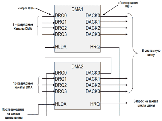 Регистр текущего адреса хранит текущий адрес ячейки памяти при выполнении цикла прямого доступа к памяти. После выполнения каждого цикла передачи данных содержимое этого регистра уменьшается на единицу. То есть при выполнении циклов регистр работает в режиме вычитающего счетчика. В режиме инициализации содержимое регистра текущего адреса принимает базовый адрес из регистра хранения базового адреса, а в счетчик циклов загружается базовое число циклов передачи данных. Для организации прямого доступа в память в компьютерах IBM PC/XT использовалась одна 4-канальная микросхема DMA 18237, канал 0 которой был предназначен для регенерации динамической памяти (сейчас регенерацию осуществляет внутреннее устройство управления микросхемы памяти). Каналы 2 и 3 служат для управления передачей данных между дисководами гибких дисков, а также винчестером и оперативной памятью соответственно. Свободным оставался только канал DMA 1. Канал DMA 1 обычно используется звуковыми картами. Один канал DMA может использоваться различными устройствами, но не одновременно. IBM PC/AT -совместимые компьютеры имеют уже 7 каналов прямого доступа к памяти. Как и для контроллеров прерываний, увеличение числа каналов было достигнуто путем каскадного включения двух микросхем i8237, интегрированных в микросхему контроллера периферии (южный мост); канал 0 DMA2 используется для подключения каналов контроллера DMA1 (рис. 6) .