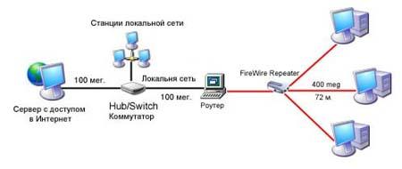 Столь длинные IEEE 1394 кабели не продаются, поэтому придется их наращивать самому, при этом лучше всего использовать витую пару и пайку. Скорость связи по наращенному кабелю падает на 50-80 мегабит. IEEE 1394 сеть идеально подходит для объединения нескольких компьютеров в пределах одной квартиры (рис 6), а с использование репитера позволяет строить сеть используя только интерфейс FireWire, так же если один из компьютеров подключён к ЛВС, то используя его в качестве роутера сеть FireWire можно объединить с обычной локальной сетью.