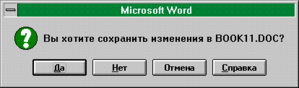 Командная кнопка (рис.1.4) - это такой элемент окна, “нажатие” на который вызывает вполне определенное действие. “Нажатие” на кнопку осуществляется либо перемещением на нее указателя мышки и щелчком левой кнопки, либо нажатием “горячей” клавиши (т.е. одновременным нажатием клавиши Alt и клавиши, соответствующей подчеркнутой букве в названии кнопки), либо нажатием клавиши пробела, если кнопка в данный момент имеет фокус (наименование такой кнопки обведено штриховой линией - на рис.1.4 это кнопка “Да”).
