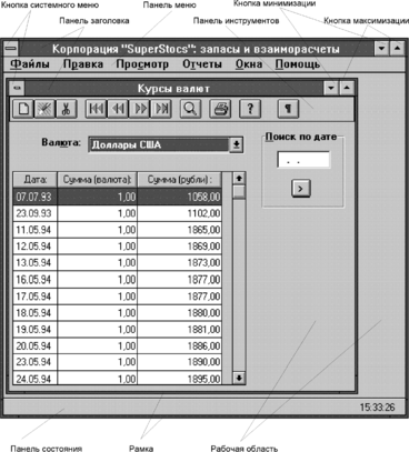 Первое, что бросается в глаза при переходе от DOS к Windows, это графическая операционная среда. Действительно, графический интерфейс пользователя (Graphical User Interface - GUI) составляет сердцевину Windows. Необходимость графического интерфейса продиктована не только и не столько эстетическими соображениями. Основное его назначение заключается в повышении уровня дружелюбности и информативности экрана дисплея, а также в предоставлении пользователю более широких возможностей по оперативному вмешательству в вычислительный процесс. Эти цели в GUI достигаются как за счет широкого использования графических шрифтов и цветовой гаммы, так и за счет введения новых типов элементов управления интерфейсом.