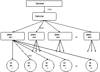 Как уже отмечалось, типовое приложение в Windows визуально представляется главным окном (или, иначе, окном-оболочкой), в рамках которого это приложение может открывать сколь угодно много дочерних окон. Любое дочернее окно содержит в себе те или иные элементы управления. Описанная цепочка легко и естественно укладывается в иерархическую структуру (рис.1.15):