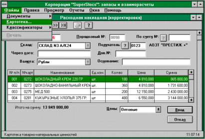 Поясним сказанное на примере. Допустим, пользователь работает в дочернем окне “Расходная накладная: корректировка" приложения “Корпорация SuperStocks: запасы и взаиморасчеты" (рис.1.16). Разработчик присвоил подклассу таких окон имя DocsOut. Предположим также, что в процессе корректировки отображаемой в дочернем окне накладной ему потребовалось уточнить содержание картотеки учета товарно-материальных ценностей. Для этого он в меню “Файлы” выбирает вариант “Картотека". Пусть разработчик данного приложения связал этот вариант с командным событием Cards. В этом случае диспетчер приложения вначале попытается отыскать в работающей программе описание оконного подкласса с тем же именем. Если разработчик предусмотрел подкласс таких окон, то система времени исполнения автоматически создает экземпляр этого окна, отображает его поверх окна “Расходная накладная: корректировка”и делает активным (рис.1.17). Новое окно с названием “Картотека” имеет собственные меню и элементы управления и полностью готово к работе.