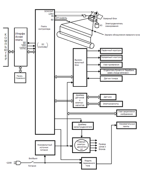 Плата DС Соntroller предназначена для координации работы всех блоков и узлов лазерного принтера в процессе печати. Контроллер обеспечивает синхронную работу следующих узлов: лазерного блока, электродвигателей М1 и М3 блока высокого напряжения, блоков проявления, передачи и закрепления изображения, узлов продвижения бумаги, датчиков и электромагнитов. Блок-схема лазерного принтера приведена на рисунке 4.