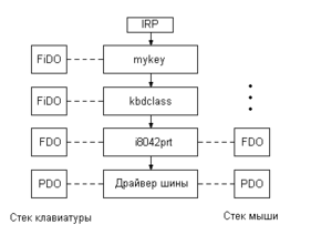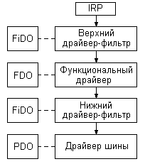 Все объекты FDO и FiDO позиционируют себя в стеке устройств. Порядок объектов в стеке определяет порядок обработки запросов ввода-вывода. Если необходимо перехватить и обработать запрос, непосредственно идущий от пользователя, то нужно устанавливать верхний фильтр. Если же нужно отслеживать обращение к портам ввода вывода, обрабатывать прерывания, то нужен нижний фильтр. Данная модель позволяет драйверу устанавливать callback процедуры. Когда запрос начинает обрабатываться, то он обрабатывается последовательно всеми драйверами стека устройства (исключая ситуацию, когда какой-либо драйвер сам завершит обработку запроса). После этого диспетчер ввода-вывода передает запрос callback процедуре каждого драйвера стека. Сначала запрос передается callback процедуре последнего драйвера который в стеке, потом процедуре предпоследнего драйвера и.т. д. Callback процедуры нужны для того, чтобы обработать прочитанную из устройства информацию. Если фильтр обрабатывает запросы на чтение, то когда этот запрос поступит в драйвер информация еще не будет считана. Поэтому драйверу необходимо установить callback функцию. При ее вызове запрос уже будет содержать считанные данные.
