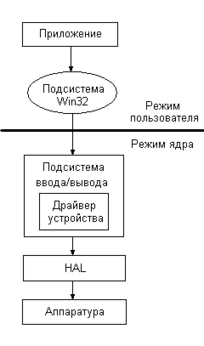 Архитектура ввода / вывода в Windows XP имеет иерархическую структуру. Для осуществления операции ввода / вывода пользовательское приложение должно вызвать одну из функций API. Эта функция создает необходимый IRP пакет и направляет его подсистеме ввода / вывода. Подсистема ввода / вывода направляет IRP пакет необходимому драйверу. Драйвер осуществляет обращение к устройствам, используя функции HAL.