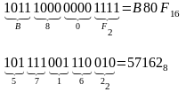 16-pазpядне двійкове число із знаковим розрядом можна представити 6-pозpядним вісімковим, причому старший байт в нім прийматиме значення лише 0 або 1. У шістнадцятковій системі таке число займе 4 розряди.