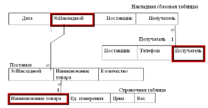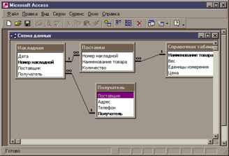 Таблица Накладная содержит первичный ключ – поле Номер накладной и внешний ключ – поле Получатель. Таблица Получатель содержит только один первичный ключ – поле Получатель.