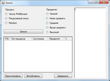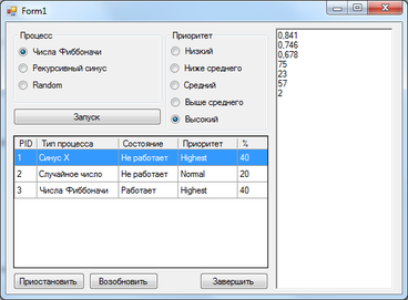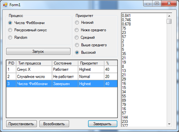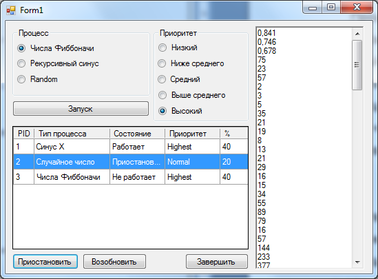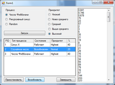 Область "Процесс" позволяет выбрать тот процесс, который нам необходимо запустить. Имеет три пункта: Числа Фибоначчи, Случайные числа и Рекурсивный синус.