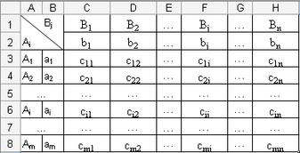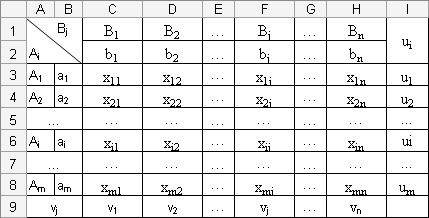 1. Для удобства расчетов необходимо отдельно создать матрицу, отображающую стоимость перевозок (Cij) (рис 3.1.), а также матрицу, которая должна будет отображать искомый план перевозок (рис. 3.2.).
