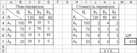 «Поиск решения» выдает другой план перевозок, и значение целевой функции на данном промежутке остается неизменным F(x)min = 910. Полученный план перевозок при значении k=4 изображен на рисунке 4.4.8.
