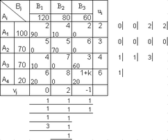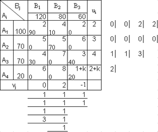 | A4B1 | v1+u4=6 | u4=6 | A4B3 | v3+u4<=1+k | соблюдается |
