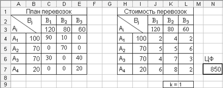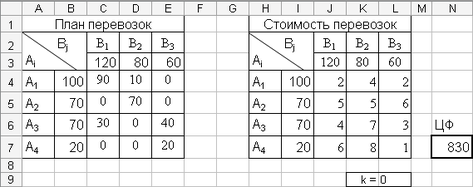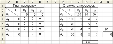 Создадим в окне программы Ms Excel две матрицы «План перевозок» и «Стоимость перевозок», согласно вышеизложенным правилам (рис 4.4.1). Также нужно указать ячейку содержащую изменяемый параметр k. При этом в клетке A4B3 матрицы «Стоимость перевозок» устанавливаем формулу, отображающую зависимость данного тарифа от параметра k: L7=1+L9.