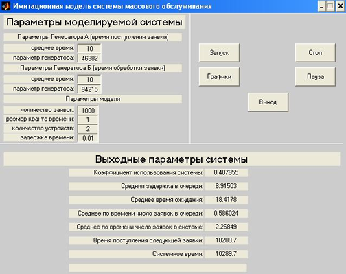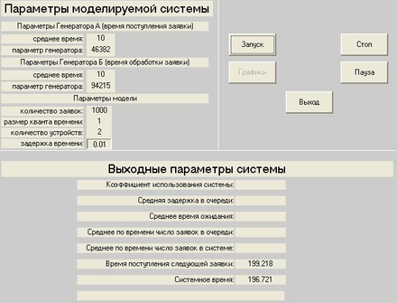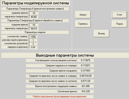 При нажатии на клавишу «Запуск» мы видим диалоговое окно, представленное на рисунке 4.6. Здесь можно заметить, что поля ввода входных параметров неактивны для изменения. Так же в графе «Выходные параметры системы» результаты показываются только по двум пунктам: системное время и время поступления следующей заявки. Кнопка «Графики» неактивна. Соответственно происходит выполнение работы программы.