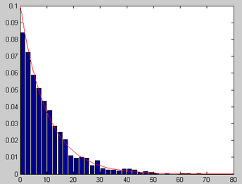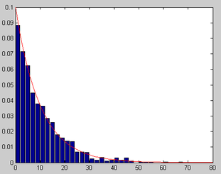 Эта гистограмма показывает, что смоделированная случайная величина A распределена по экспоненциальному закону. Математическое ожидание случайной величины А равно 10.