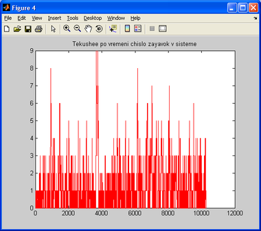 график текущего по времени числа заявок в системе на рисунке 4.9;