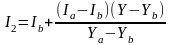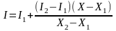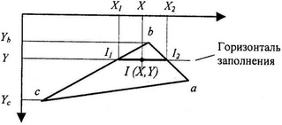 Значения интенсивностей I1 и I2 на концах горизонтального отрезка представляет собой интерполяцию интенсивности в вершинах: