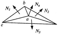 определяются усредненные нормали в вершинах - производится усреднение нормалей примыкающих граней. На иллюстрации приведен пример – вектор нормали в вершине a равен