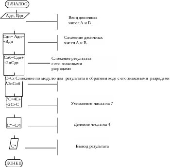 Для получения числа С необходимо модуль разности чисел А2 и В2 умножить на семь и разделить на четыре. Сумма чисел Адп и Вдп даст результат так же в дополнительном коде. Получить прямой код результата, который будет равен разности чисел А2 и В2, можно при помощи арифметического сложения Сдп с его же знаковыми разрядами: