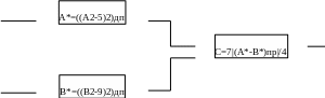 Из предыдущих вычислений следует, что С вычисляется по формуле С=7|A-B|/4, число А двоично-пятиричное и поступает с севера, В - двоично-девятиричное и так же поступает с севера, вычитание производится в дополнительном коде, результат выдаётся на север и количество тактов программирования не превышает двухсот сорока.
