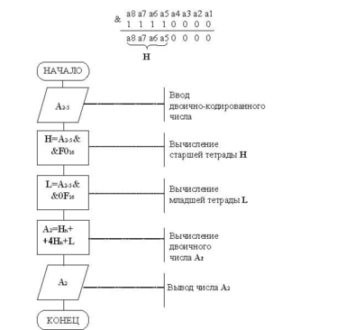 Таким образом, обработка числа А состоит в выделении старшей тетрады, выделении младшей тетрады, умножении H на пять и сложении с L. Подробно эти действия представляет алгоритм на рис.2.
