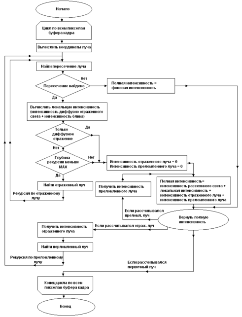 Рис. 2.1.1. Блок-схема рекуррентного алгоритма обратной трассировки лучей.