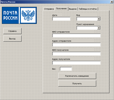 Вкладка «Получение» формы «Почта» (см. рис. 7) содержит полностью аналогичные элементы для ввода исходных данных. Отсутствует лишь компонент Label, на который выводится стоимость отправки (за ненадобностью). Проверка введённых данных осуществляется аналогично. Кнопка «Распечатать извещение» подставляет введенные данные в ячейки бланка извещения (представлен на рисунке 4), кнопка «Получить» заносит данные в таблицу «Полученная корреспонденция», причём в ячейку «Выдано» значение не заносится.