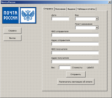 Вкладка «Отправка» (см. рис. 6) содержит следующие элементы: TextBox «Дата», 2 компонента ComboBox для выбора вида корреспонденции (посылка, бандероль или заказное письмо) и пункта назначения, 4 компонента TextBox для ввода ФИО и адреса получателя и отправителя, отдельный TextBox для ввода веса корреспонденции. При изменении вида корреспонденции, пункта назначения либо веса (обрабатываются события OnChange соответствующих компонент) автоматически рассчитывается стоимость отправки, которая отображается на компоненте Label10. Кнопка «Отправить» добавляет введённые пользователем данные в таблицу «Отправленная корреспонденция», кнопка «Распечатать квитанцию об оплате» подставляет введённые пользователем данные в ячейки квитанции (см. рис. 5). Автоматически осуществляется проверка введённых пользователем данных: если какое-либо из полей не заполнено, в поле «Вес» содержится нечисловое значение, в поле «Дата» - значение, которое не является датой, то запись данных произведена не будет и пользователь увидит сообщение об ошибке.