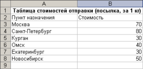 Рисунок 1 – Таблица стоимостей отправки посылок